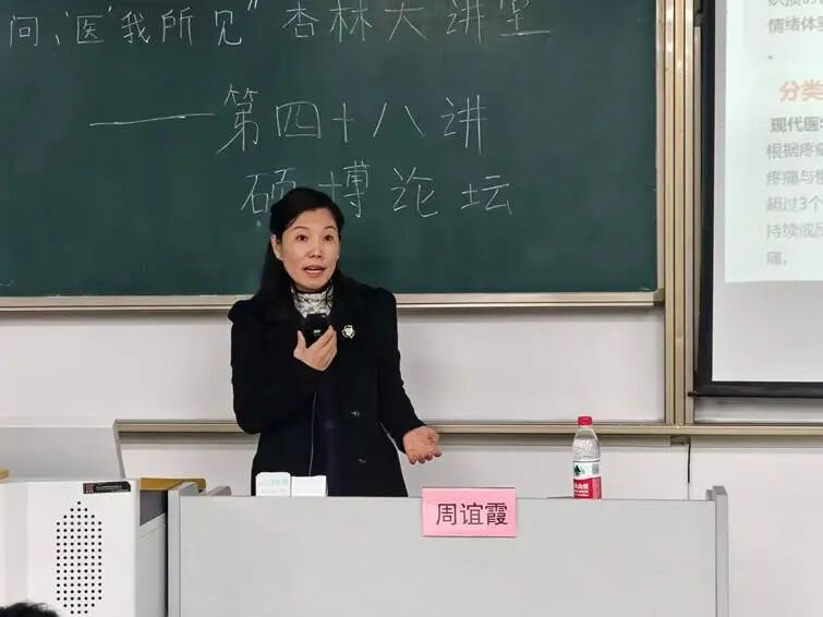 讲座中,周谊霞老师以“痛”字的文字演变开篇,追溯其从古至今的文化认知渊源,极大吸引了同学们兴趣。随后,她围绕疼痛核心认知展开详细阐释:明确现代医学中疼痛的定义和分类,强调其生理心理社会多维属性;阐释中医“不通则痛”“不荣则痛”的核心定义,凸显整体辨证思维。在互动环节,周老师通过提问交流,进一步引导同学理解疼痛的机制和治疗策略,并指出中西医二者在疼痛领域理论互补与方法协同的优势,明确复合型人才需兼具中西医融合理论、协同诊疗技能及综合素养,提出了独特的培养体系。此次讲座兼具文化底蕴与专业深度,为疼痛诊疗规范化及人才队伍建设提供了有力指导。